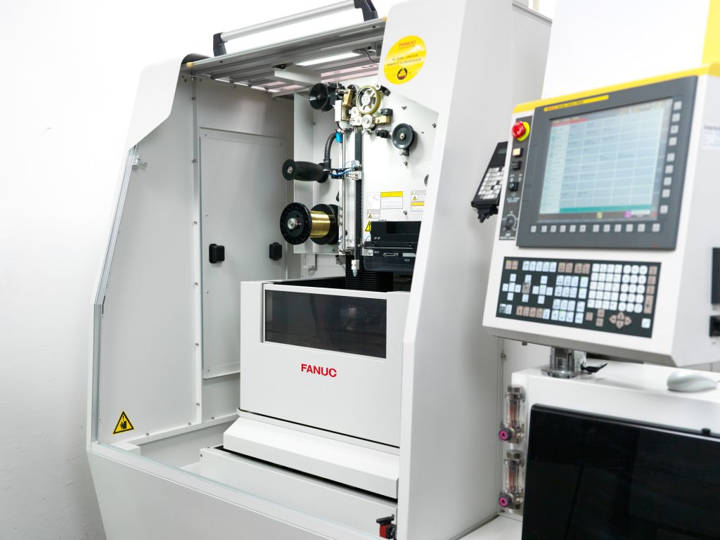 Funkenerosives Drahtschneiden und funkenerosives Startlochbohren im Aichele-Drahterosionszentrum mit 4 bis 5 Achsensteuerungen zur Bearbeitung von Schnittplatten, Formen und Elektroden im vollautomatischen Betrieb.